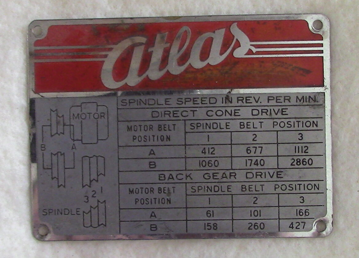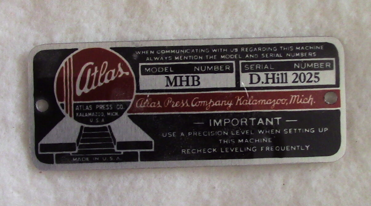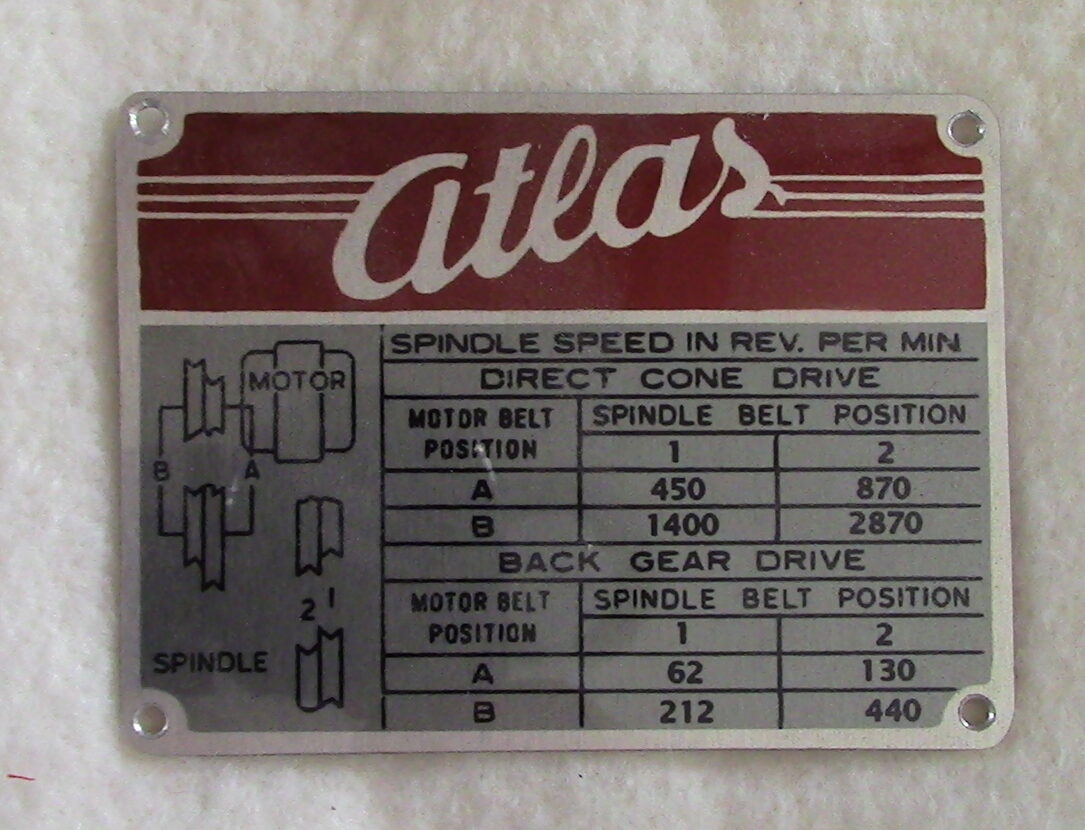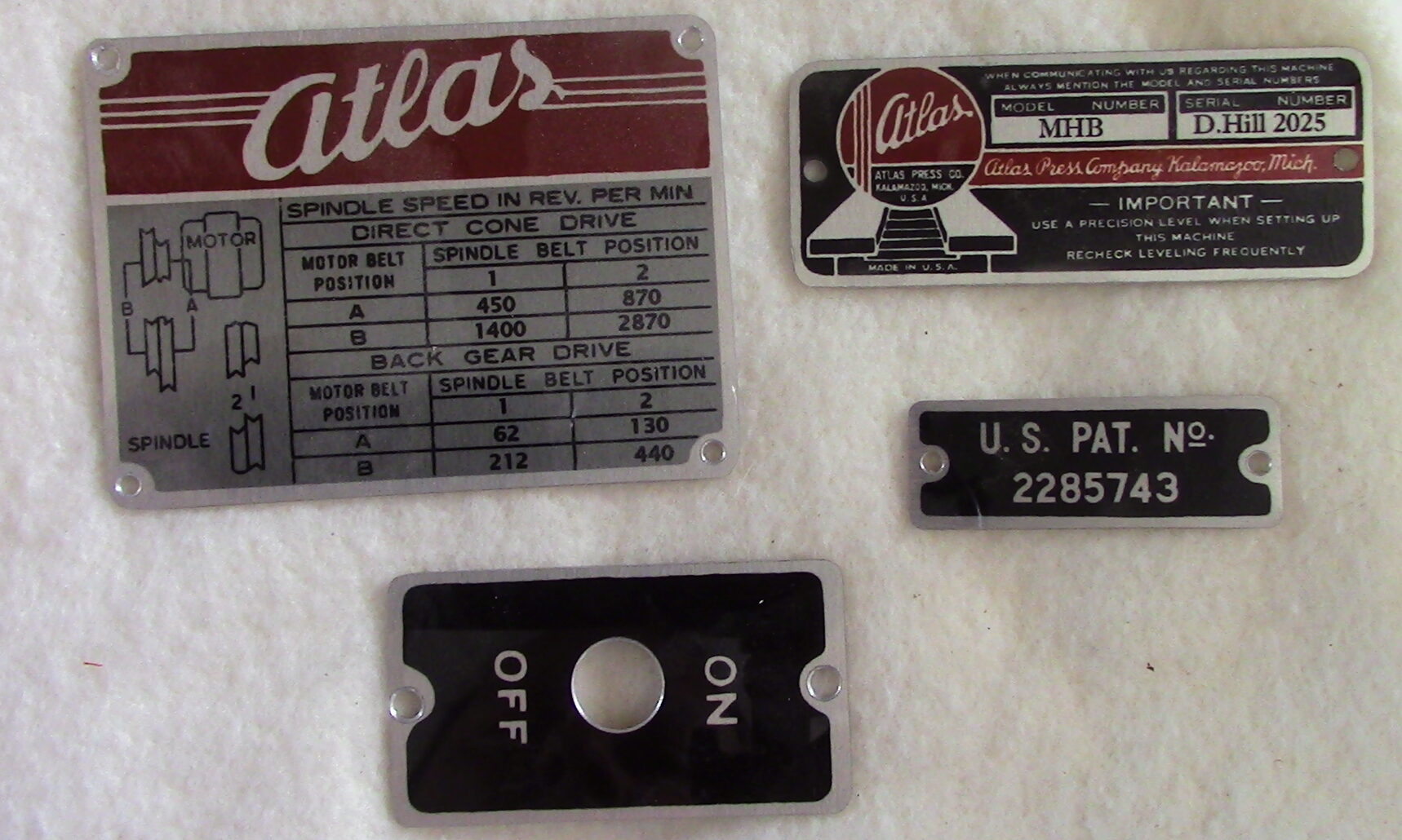 This is the label/tag set that fits the Atlas/Craftsman milling machines. The labels are printed in the proper size as the original with extra material around the outside and will need to be trimmed and drilled to match your machine as is shown in the photos. I have changed the colors slightly because I think they look a little nicer and slightly more modern. These are the blank aluminum plates and no machining has been done beyond deburring the oversized material. I have included pictures of the labels that will go on one of my machines as a reference only, and the individual on/off label shown is the way you will receive all of the labels. I have specific requirements for selling these label sets for 2 reasons, one is to try and help maintain the history of the machines by trying to maintain when a machine was actually produced by having the proper serial number and also to help prevent unscrupulous resellers from profiting from reselling parts for large markups. To purchase this set of tags I will need a photo of your original model/serial number tag for my records. If it is missing or cannot be provided I will still sell a set of tags but the serial number will be replaced with the buyers name and current year as shown in the photo of my machine label to show that the actual history of the machine cannot be traced and may be a parts machine. THE LABELS ARE PRODUCED ON AN AS ORDERED BASIS AND ARE NON REFUNDABLE so please be sure the labels are what you want and the speed chart is proper for your machine. You will also see an original speed chart for comparison and what appears to be scratches on some of the tags, this is lighting and not a blemish on the tag. I will include the proper number of drive rivets to affix the tags as were original, the switch plate will need screws to affix it