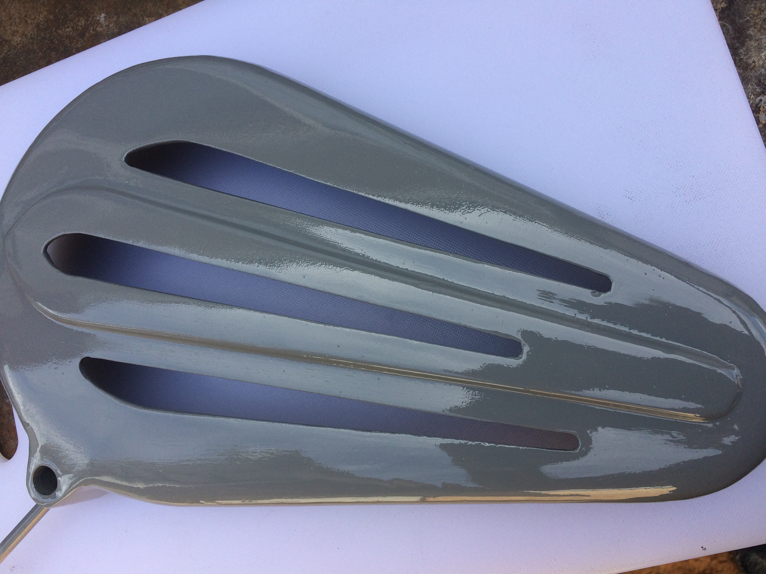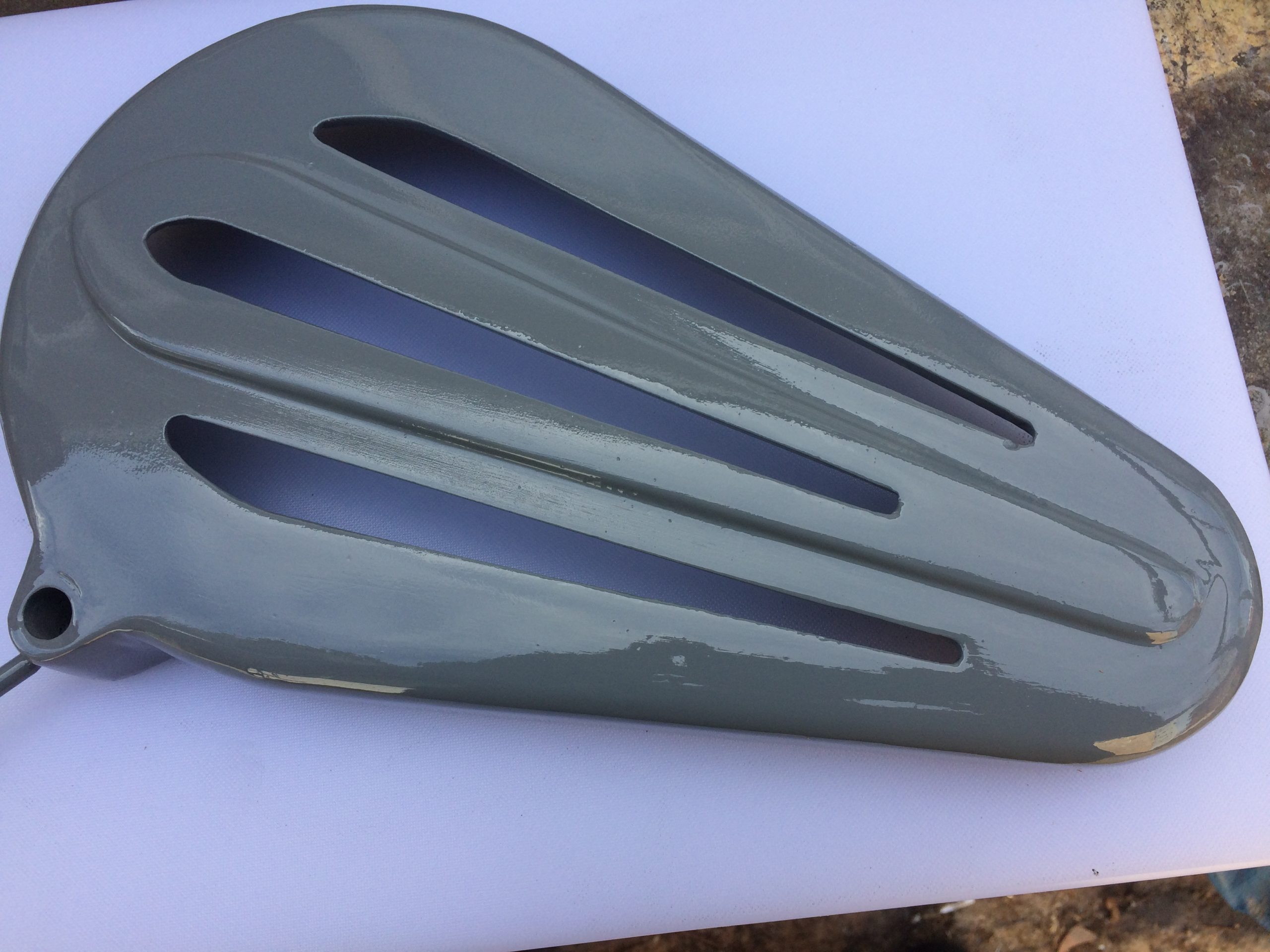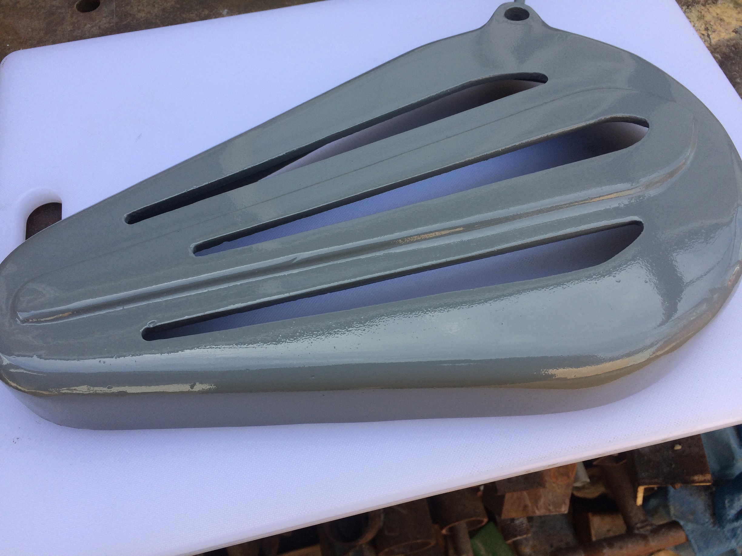This is the smaller guard that fits on the left side of the shaper and covers the motor/countershaft belt and pulleys. This is a newly manufactured part which we cast in aluminum as these parts are no longer available from the manufacturer.